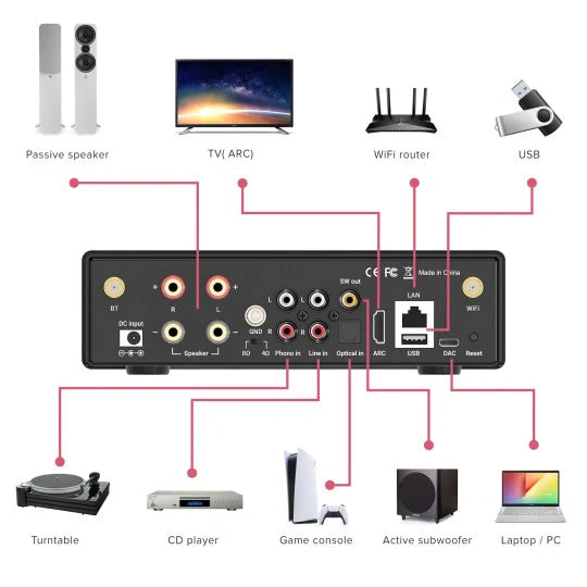 כולל מגבר עצמתי, חיבור רשת קווי ואלחוטי,